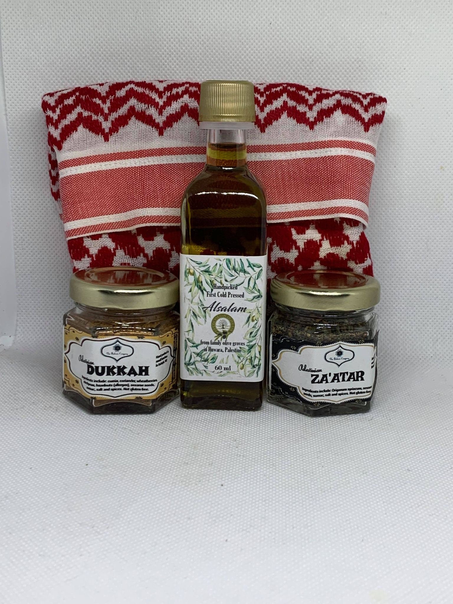 This set includes 60 ml Palestinian olive oil, a 1.5 oz glass jar of Palestinian dukkha, and 1.5 oz jar of Palestinian zaatar. Comes in small gift bag, either black/ or red/white fabric.