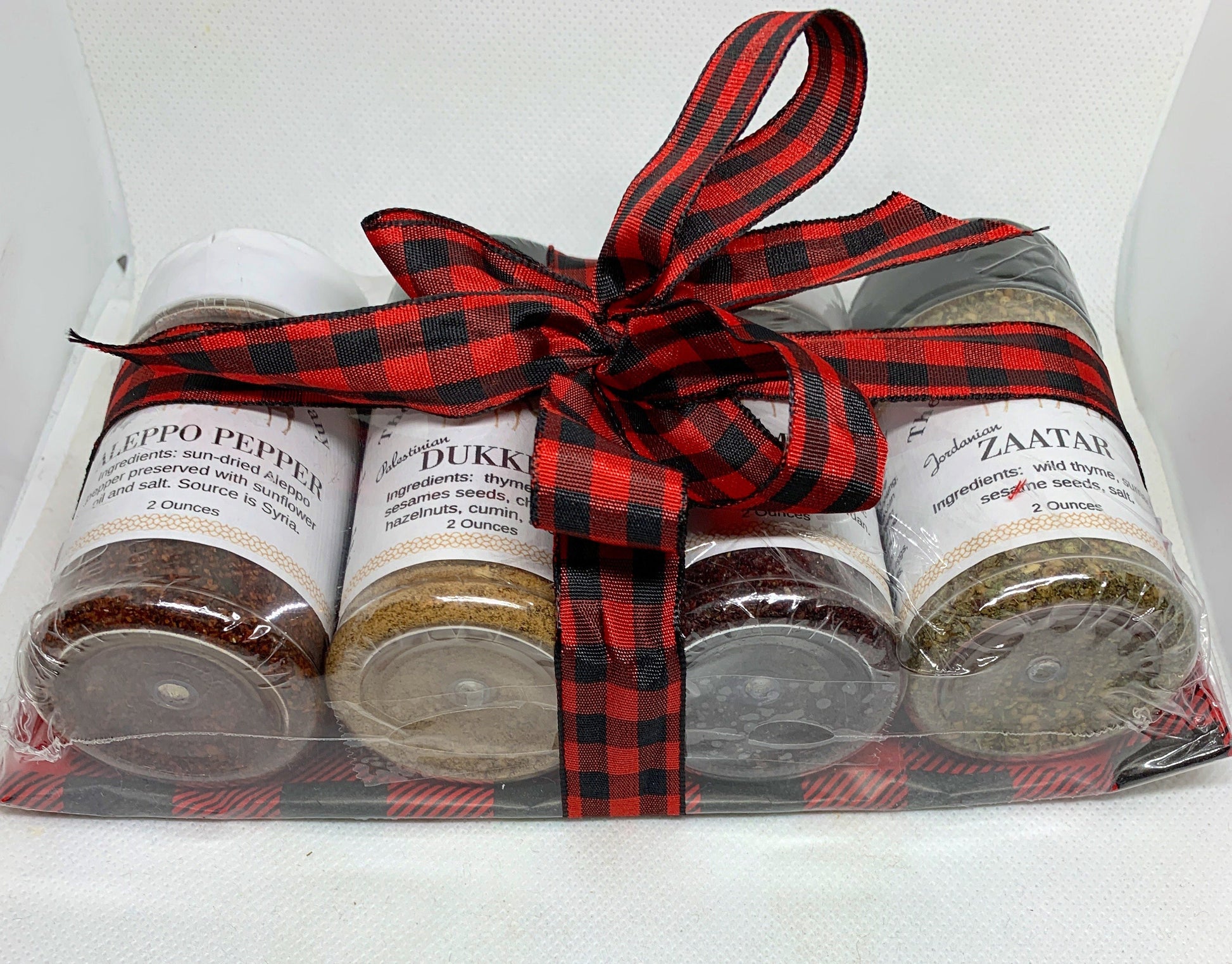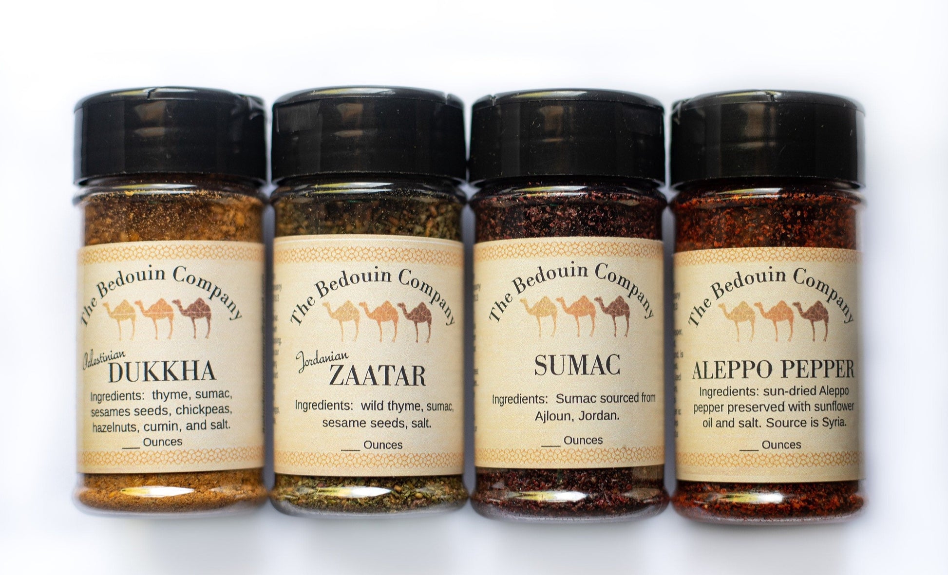 This set contains four popular natural spices and seasonings: Jordanian Zaatar, Syrian Aleppo Pepper, Jordanian Organic Sumac, and Palestinian Dukkha.