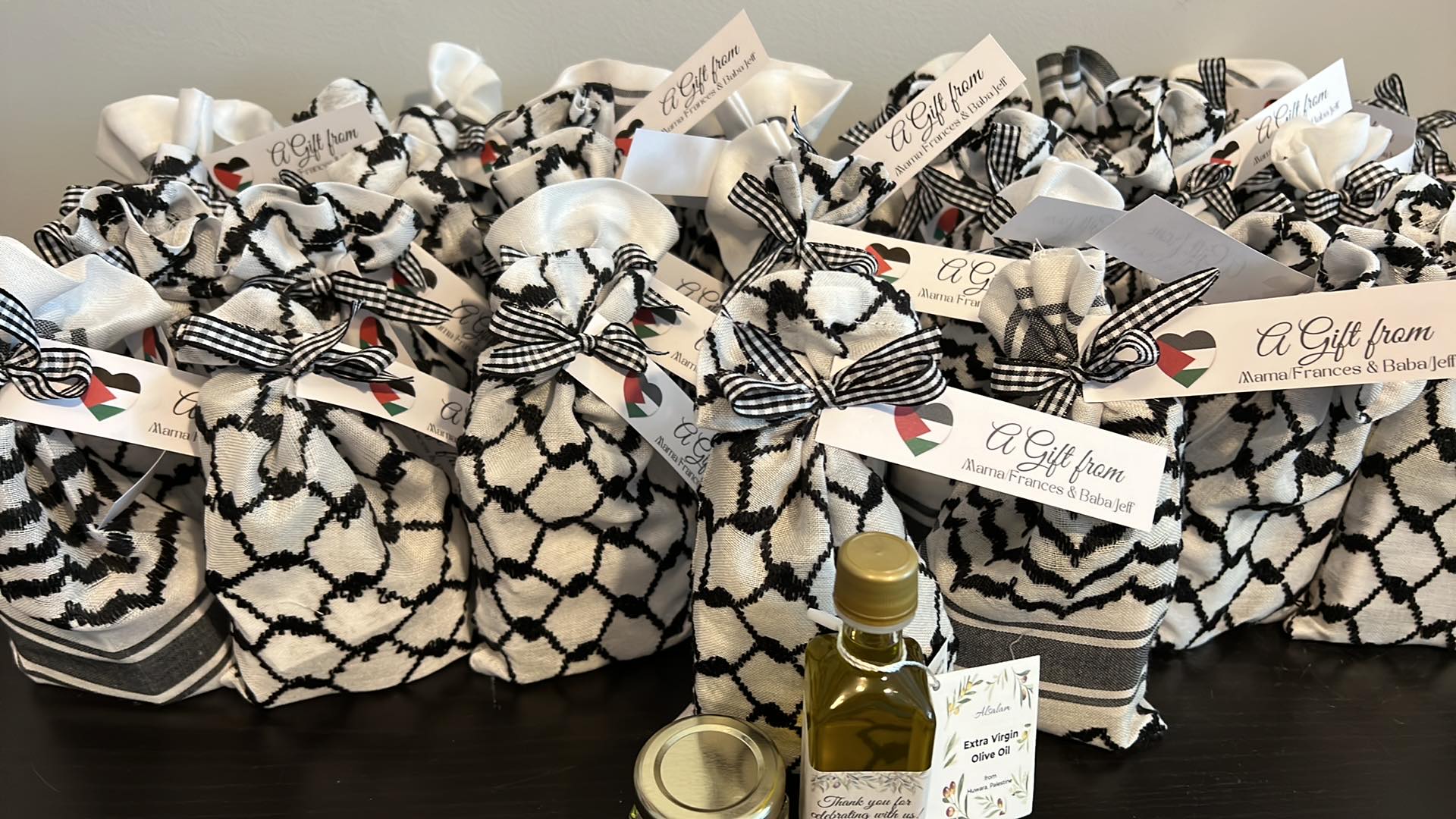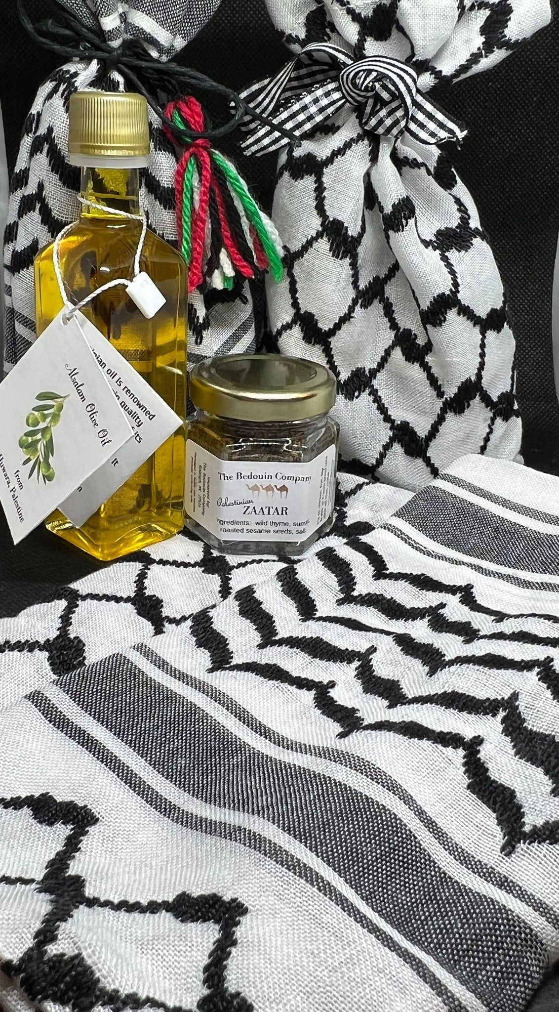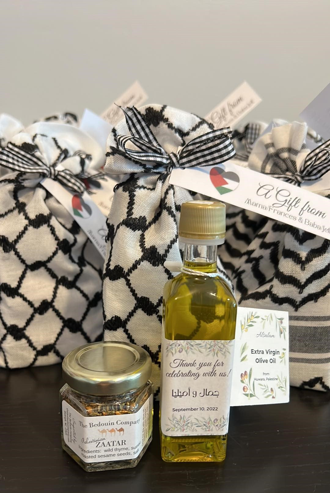 This set of 10: 10 60ml bottles of Palestinian olive oil and 10 1.5-oz glass jar of Palestinian zaatar. Comes in small black/white keffiyeh gift bag (see photo). Customized label can be added.
