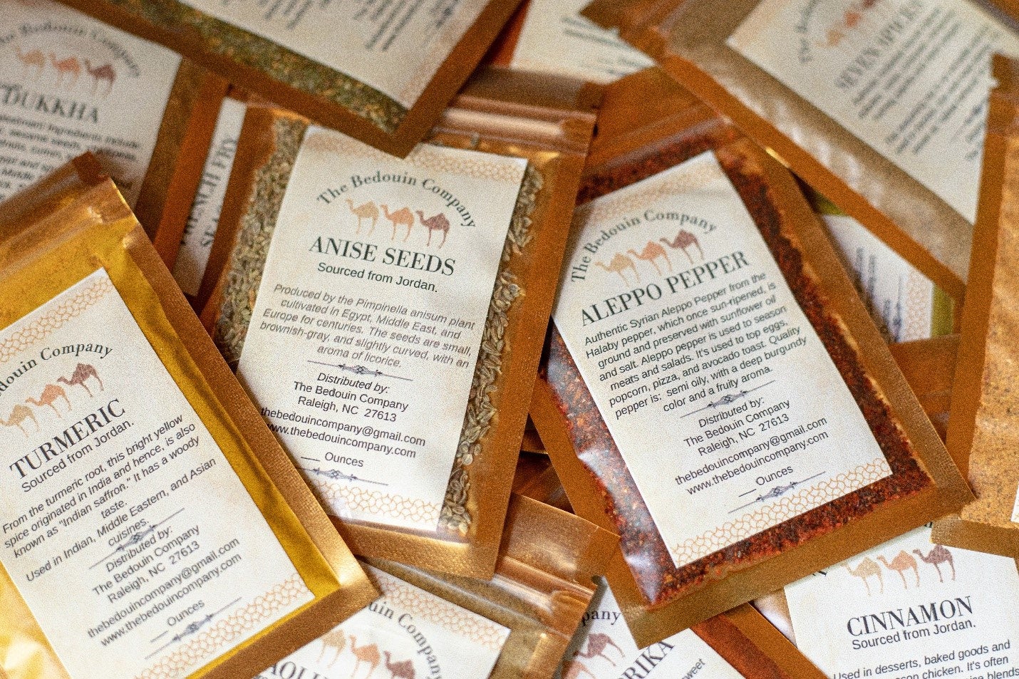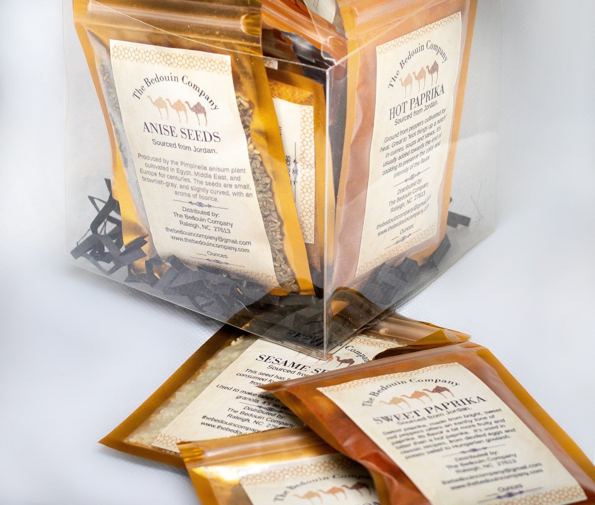 The Bedouin Company is excited to offer a sample set of 25 Middle Eastern spices in 1/2-ounce resealable bags (unless otherwise noted).
