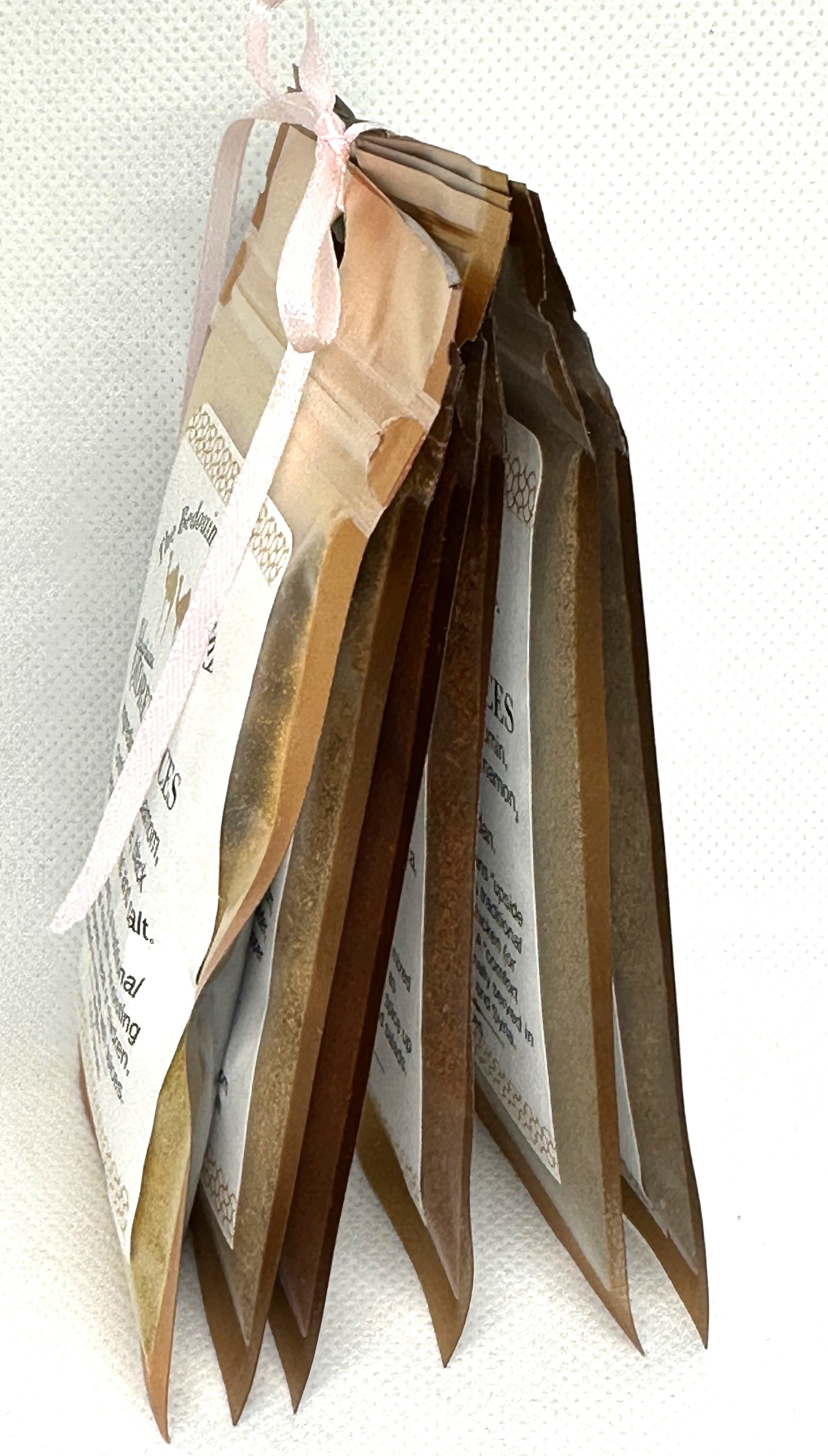 This listing is for the remaining payment of $1,530, plus applicable sales tax, on 300 units of a six-spice set, with spice bags at 1/2 ounce each. There are a total of 1,800 bags of spices (6 spice or seasoning types and 300 units of each). The spices are:
